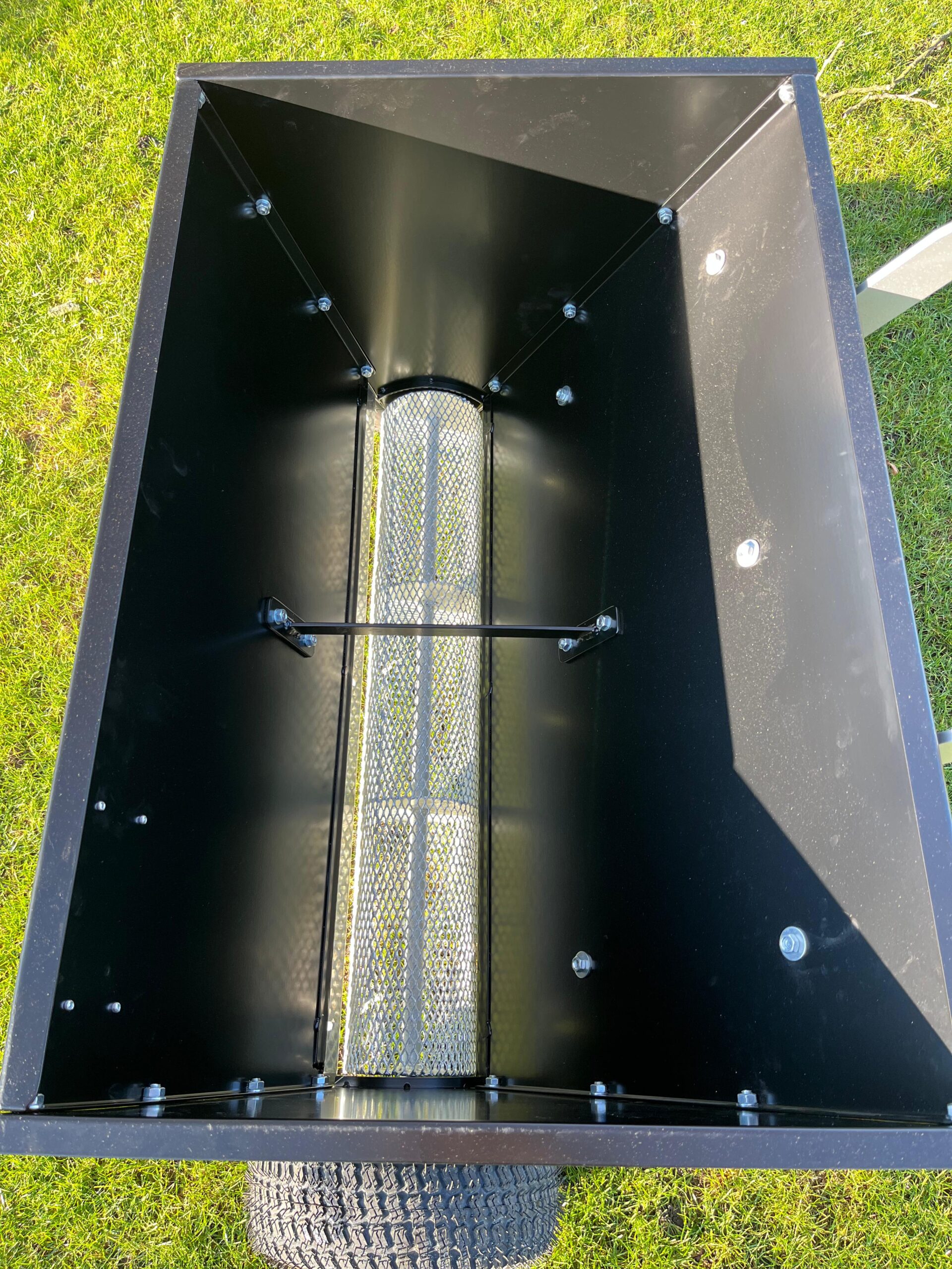 Zasobnik z blachy 2 mm i rączka 8 mm, malowane podkładem i proszkowo dla odporności antykorozyjnej